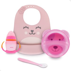 Kit com Pratinho Ursinho + Copo Com alça Removível + Colher + Babador Gumy Buba Rosa
