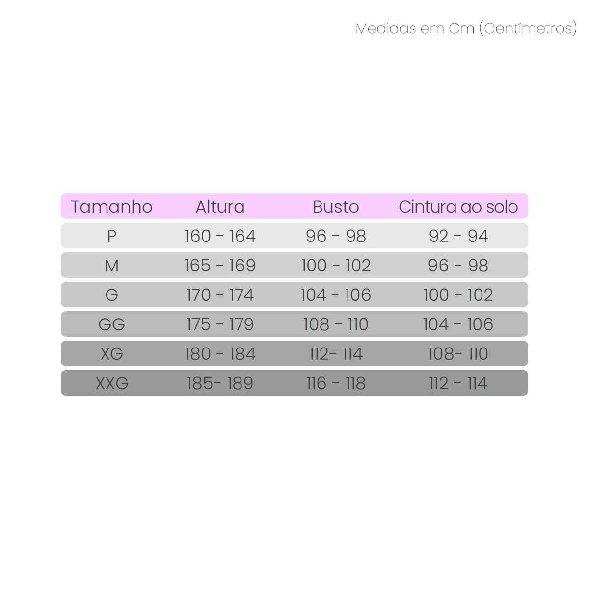 Modelo Feminino: P, M, G, GG, XG e XXG. Consultar medidas na Guia de Tamanhos.