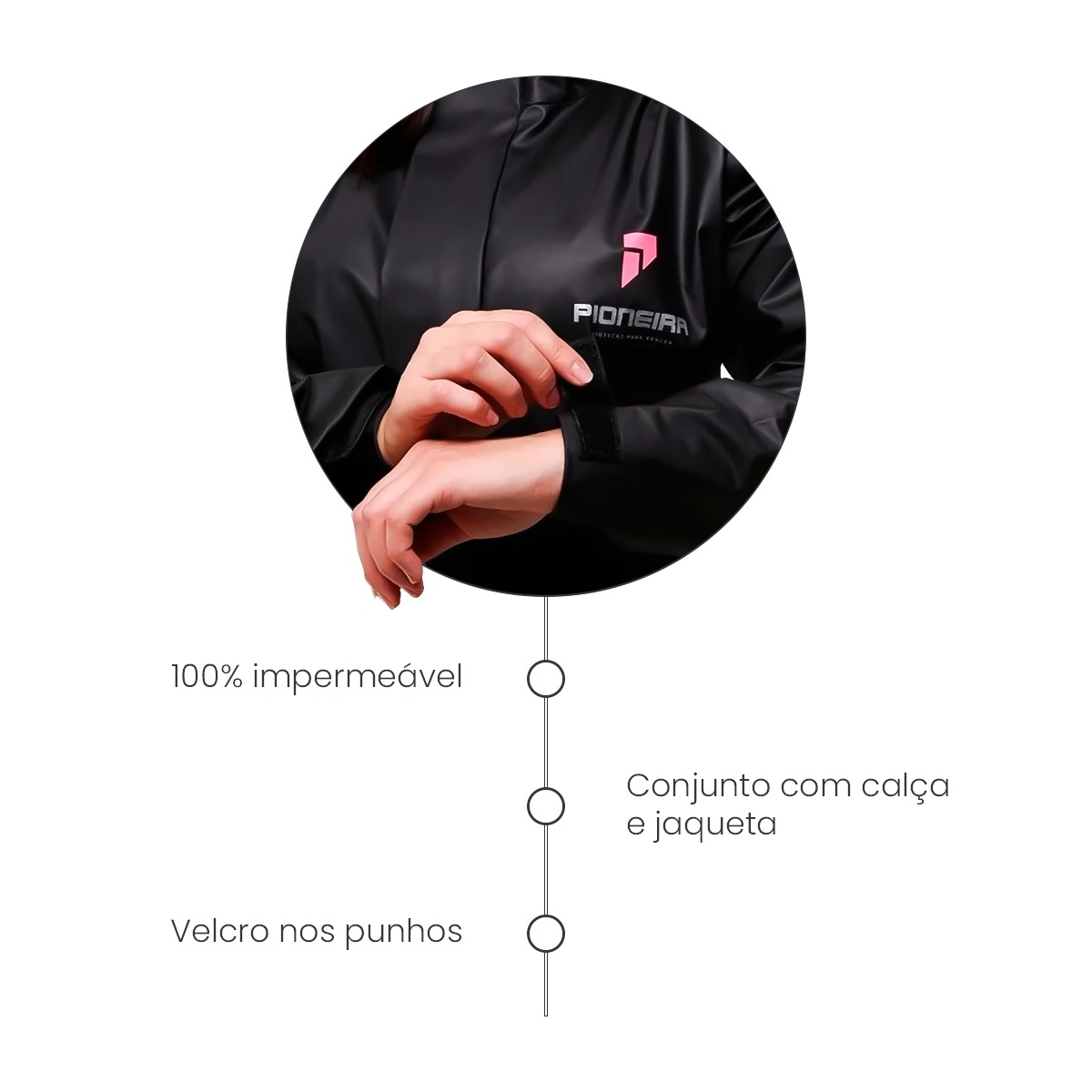 O melhor custo-benefício do mercado! A capa de chuva Pioneira é confeccionado em PVC 0,28mm, conta com uma jaqueta com fechamento através de zíper e velcro recobertos por uma lapela de drenagem, calça com elástico na cintura e regulador em velcro na bainha. opções em capuz ou gola, regulador nos punhos, serigrafia e refletivo nas costas. Calça com elástico na cintura e regulador em velcro na bainha.