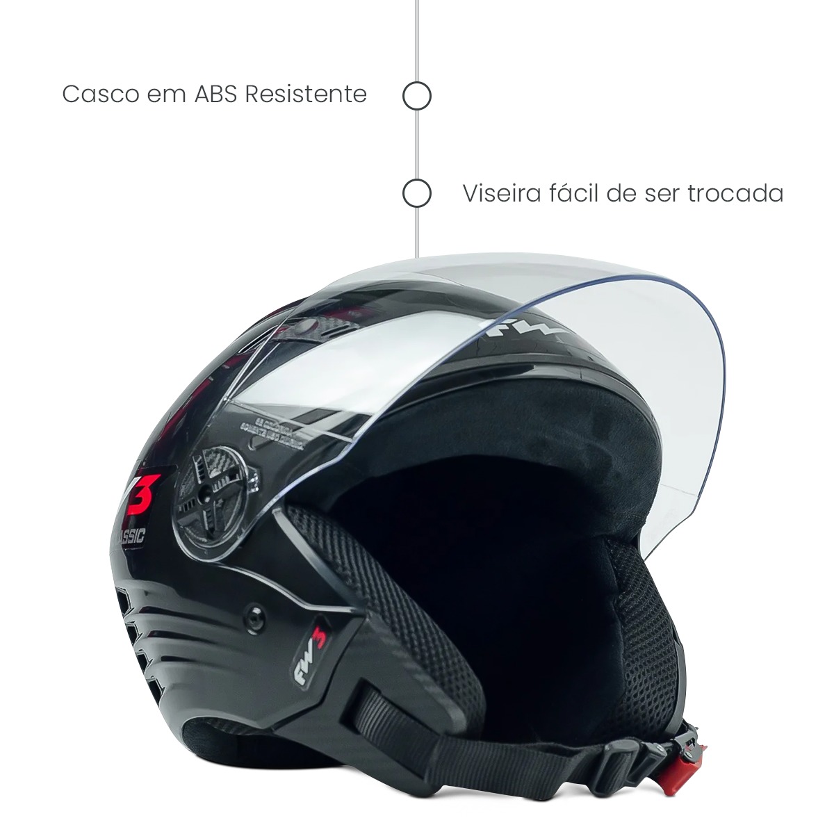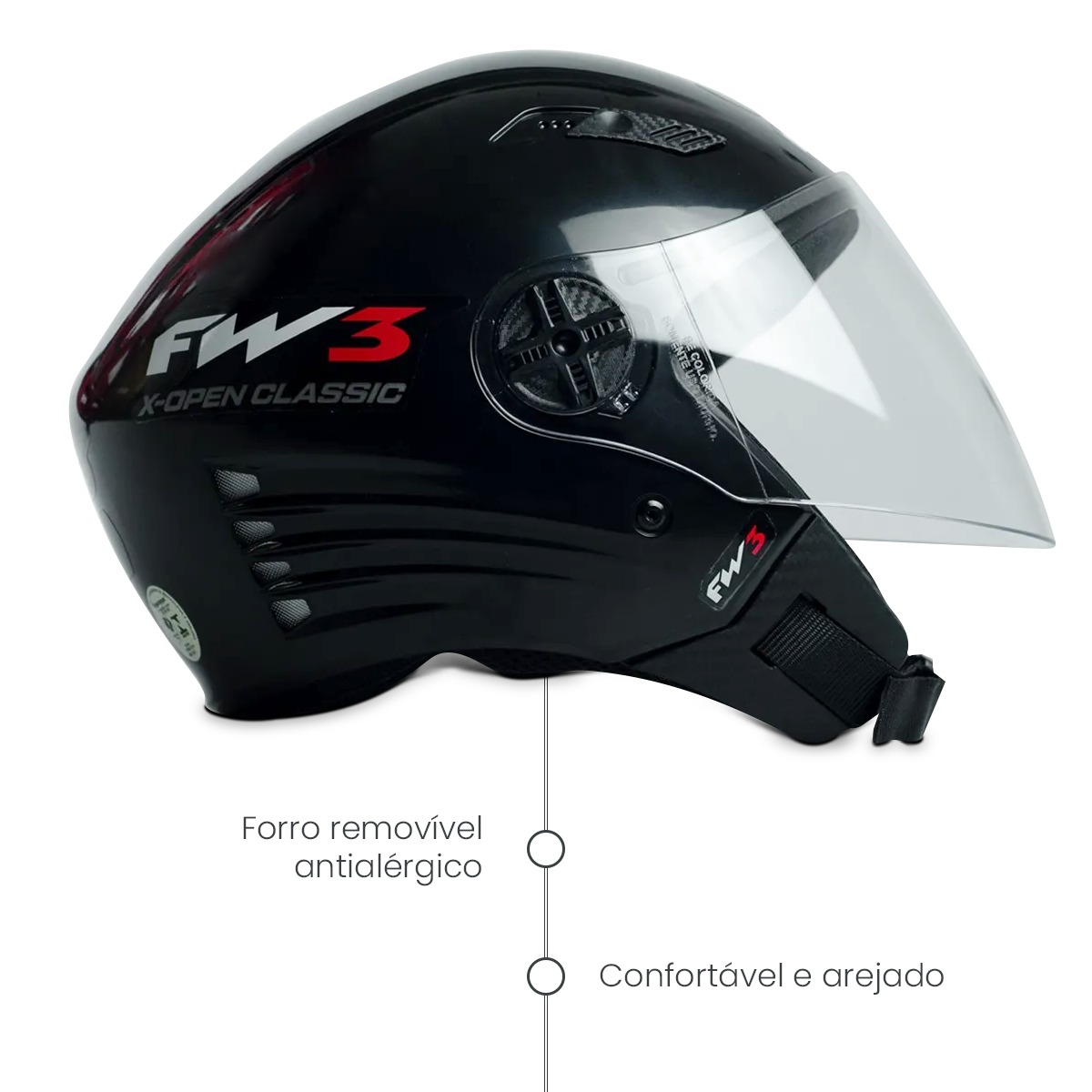 Com design esportivo e diferenciado, o capacete FW3 é perfeito para todo motociclista. Leve, estiloso e confortável, este moderno capacete vem com entrada e saída de ar, é fabricado em ABS super resistente e possui certificado de segurança. O melhor para você motociclista andar por aí com muita segurança, conforto e estilo!