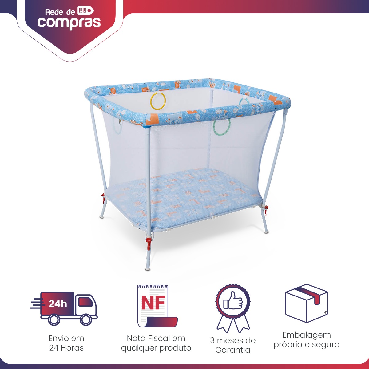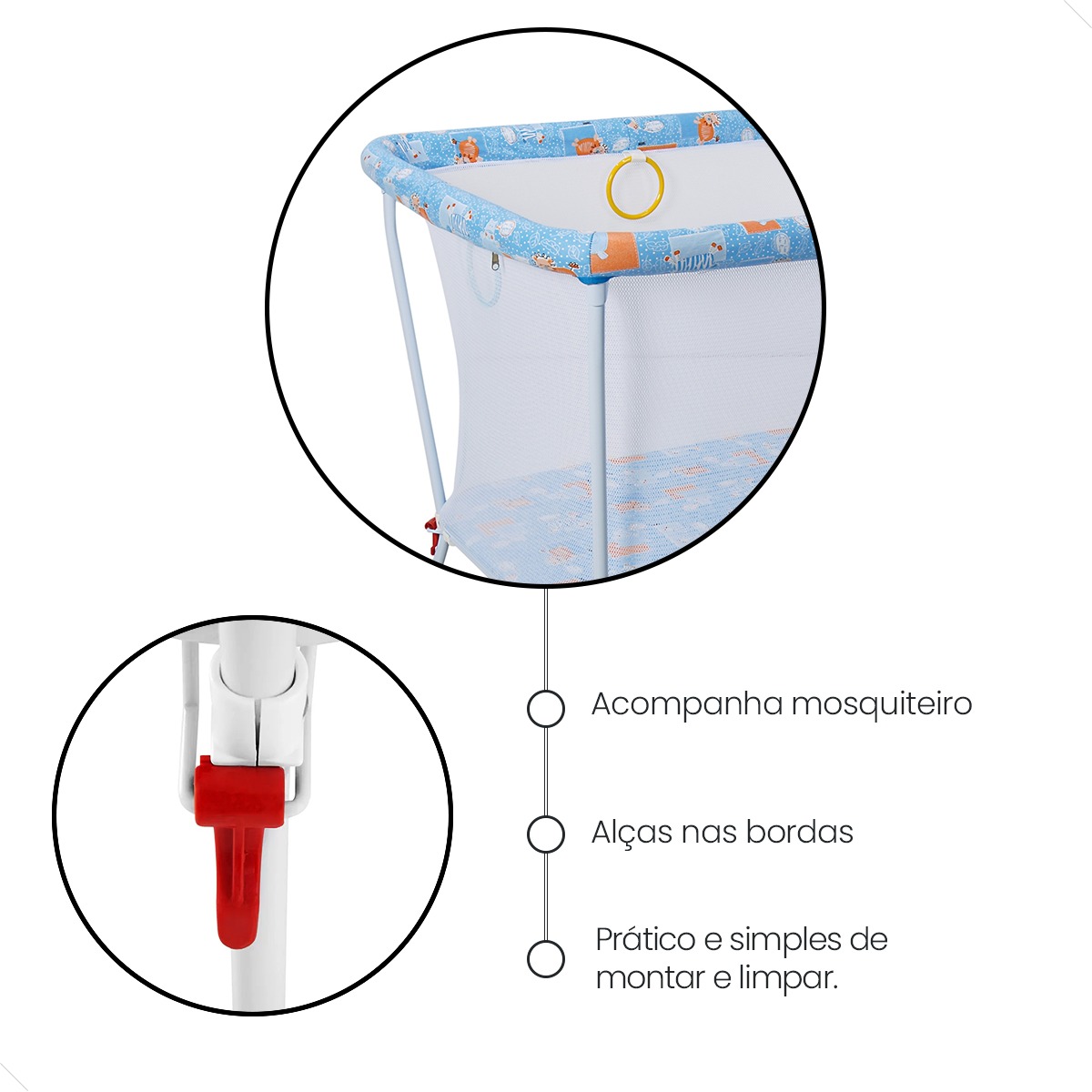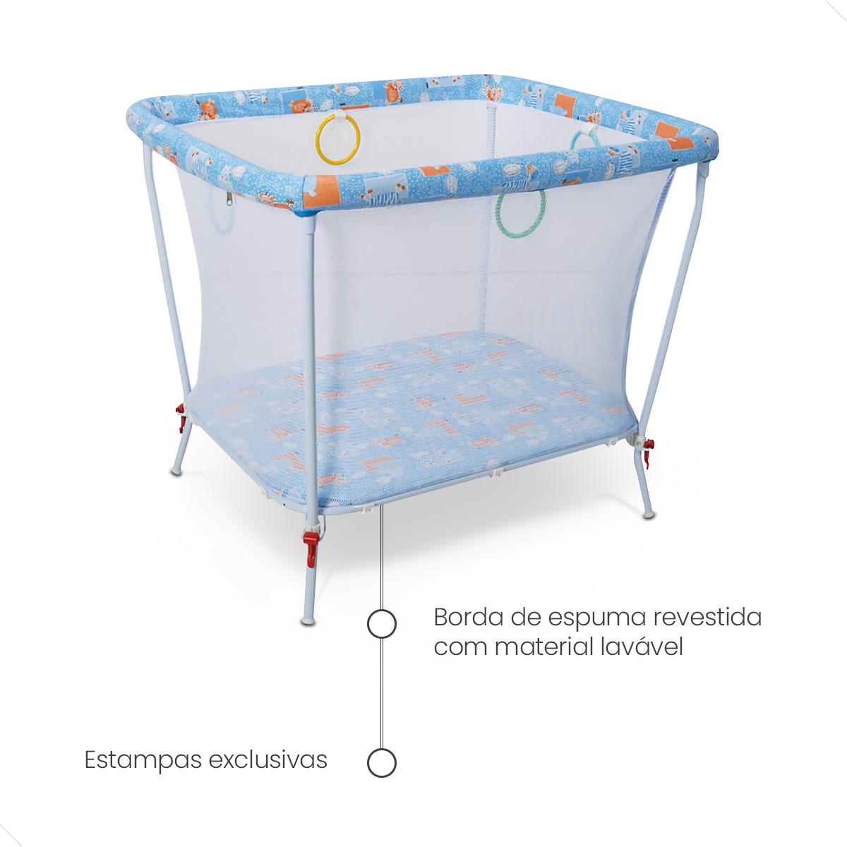 Confeccionado em tela macia que envolve toda a estrutura tubular, permitindo que o bebê fique confortavelmente protegido enquanto brinca ou dorme