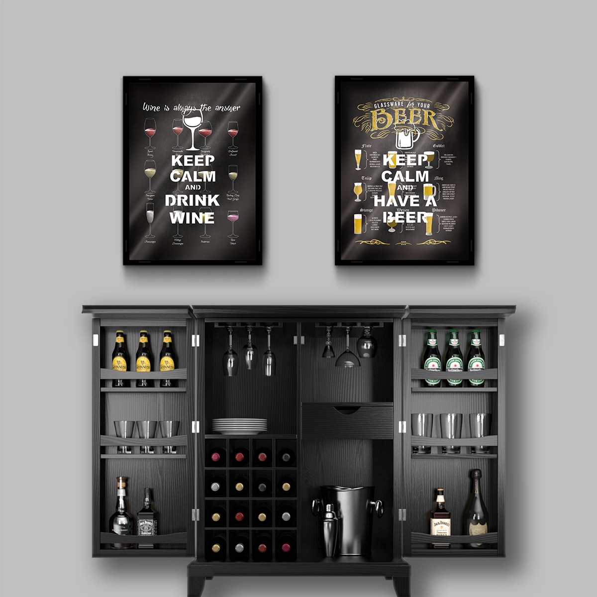 Kit com 2 Quadros Grandes: 1 Porta Rolha Vinho + 1 Porta Tampinha Cerveja