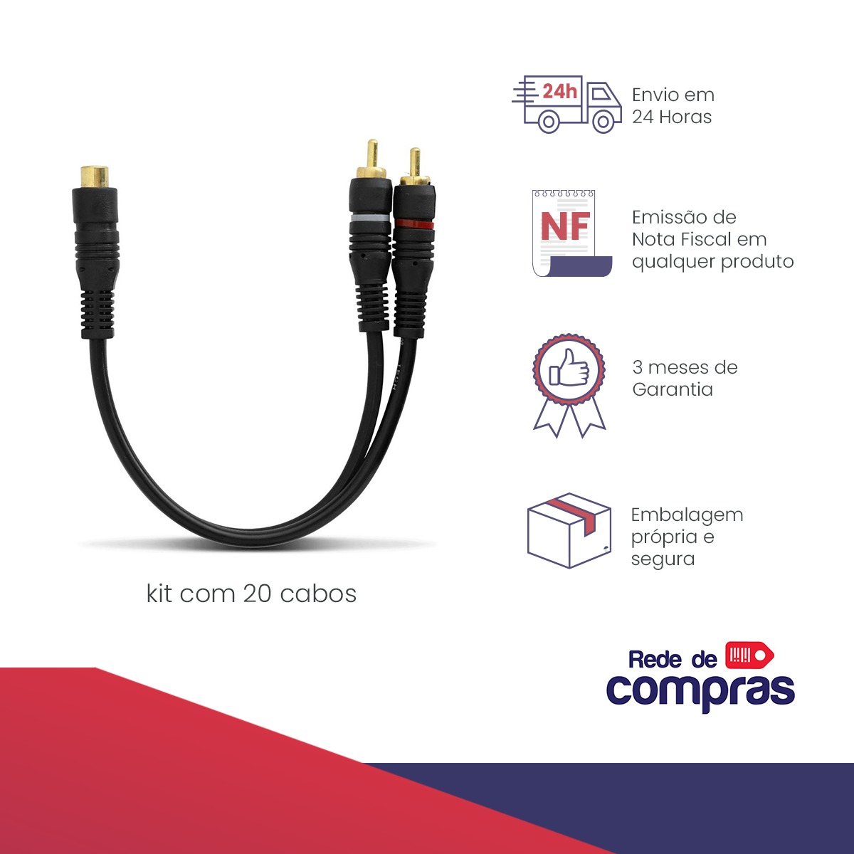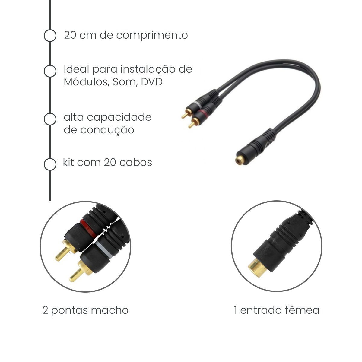 Kit com 20 Cabos de Áudio Y RCA 2 Macho 1 Fêmea