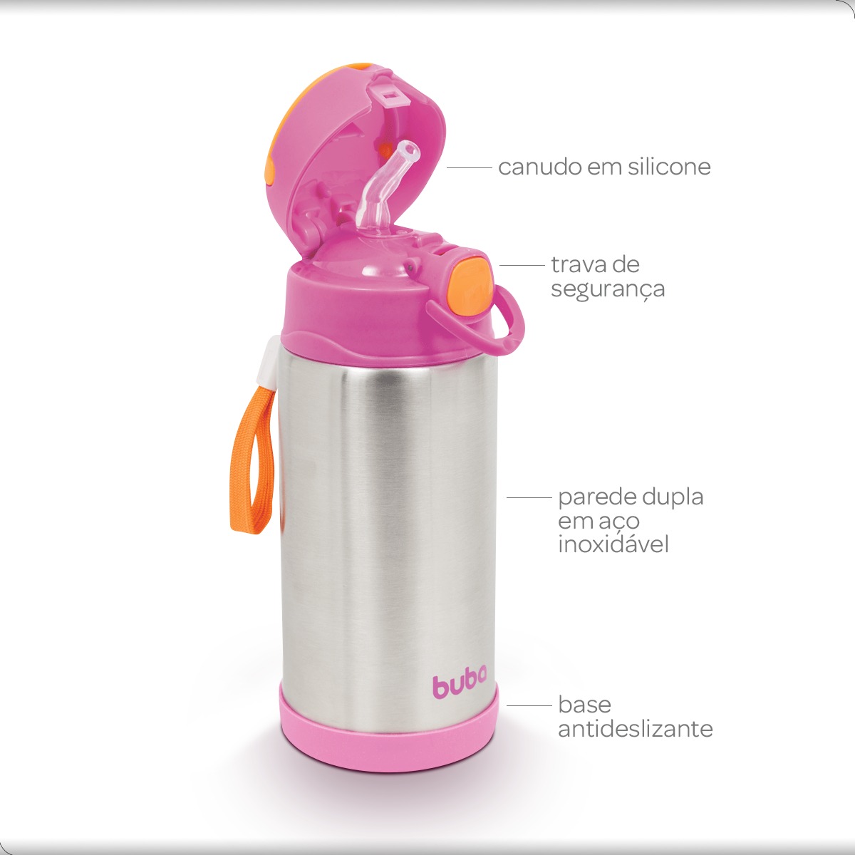 O copo térmico em Inox com canudo da Buba possui tecnologia de isolamento a vácuo com parede dupla em aço inoxidável, trava de segurança para a tampa, base em silicone antiderrapante e canudo macio de silicone que é vedado e não vaza quando está fechado.