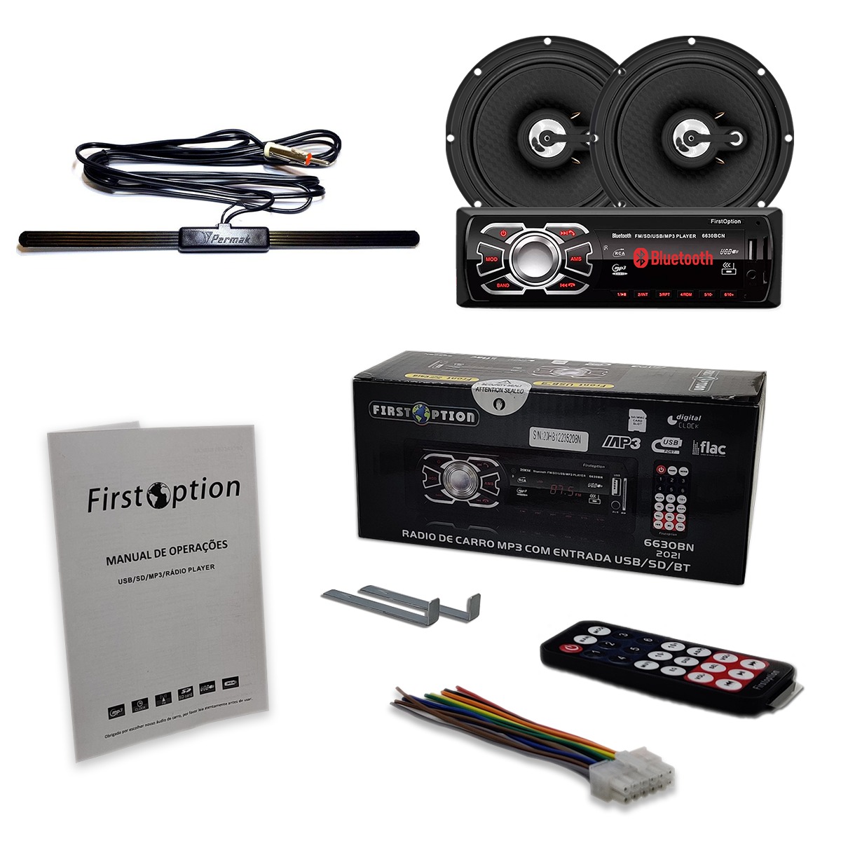Kit Rádio FM + 1 par de Alto-falantes 6" Polegadas Som Automotivo + Antena Eletrônica – Cód. 6630 + 1001 + 100/H