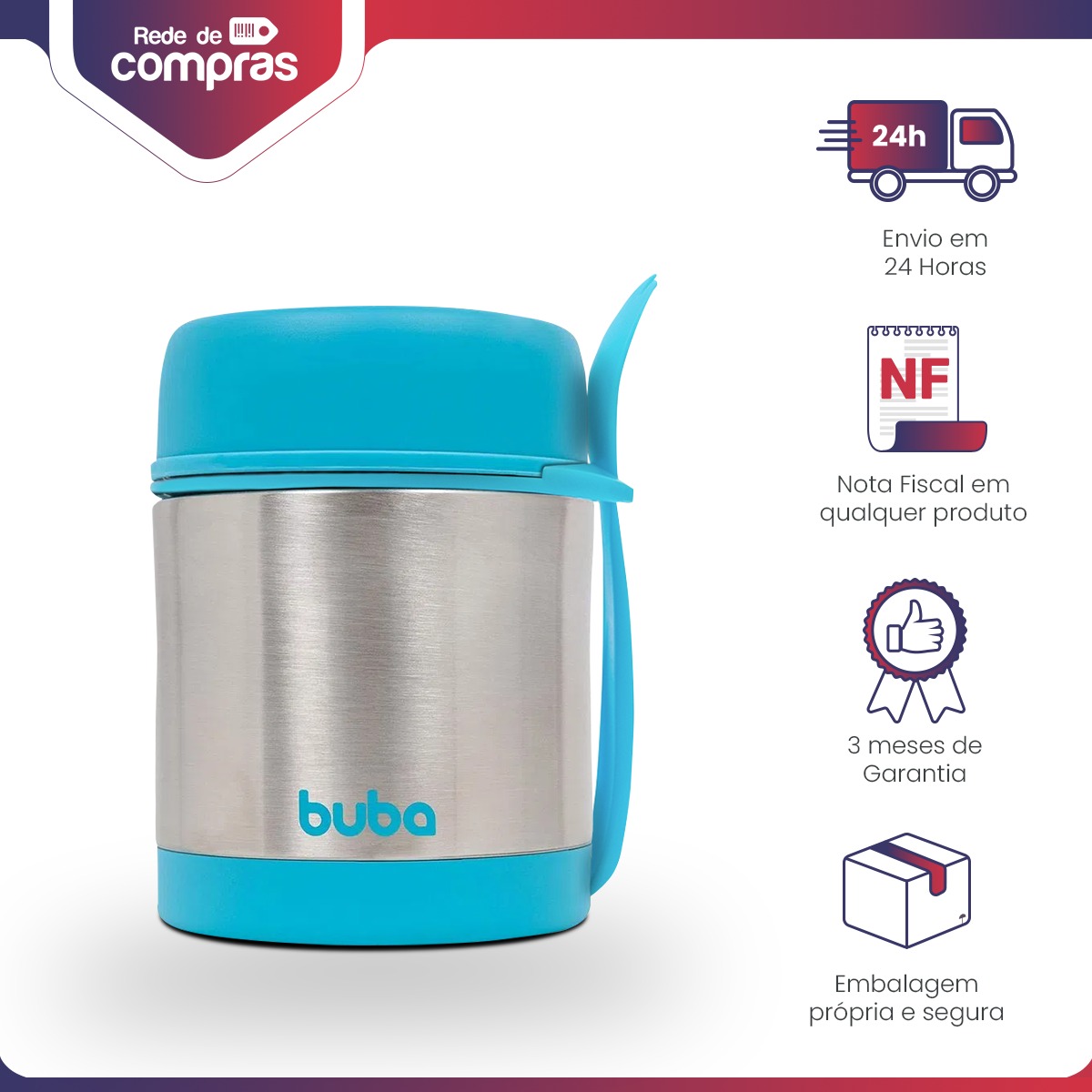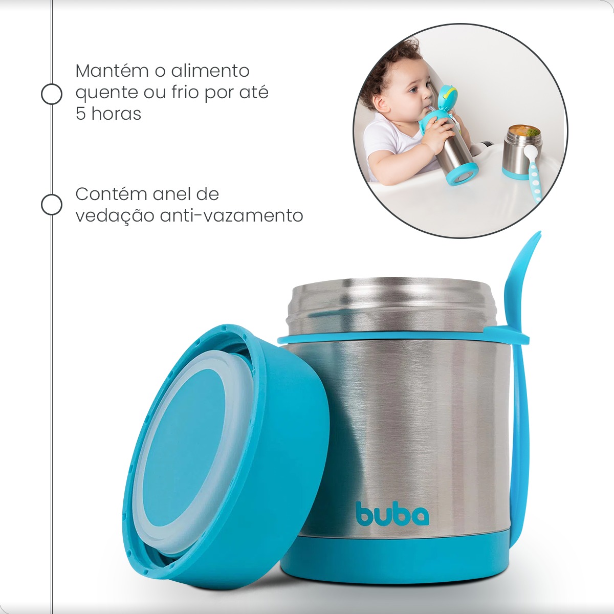 O Pote Térmico em Inox da Buba possui tecnologia de isolamento a vácuo com parede dupla em aço inoxidável. É resistente, higiênico e fácil de limpar, com tampa ideal para levar em passeios e viagens, e refeições fora de casa, em geral, pois ajuda a conservar a temperatura dos alimentos por mais de 5 horas. Pode ser utilizado para armazenar papinhas, frutas e legumes.