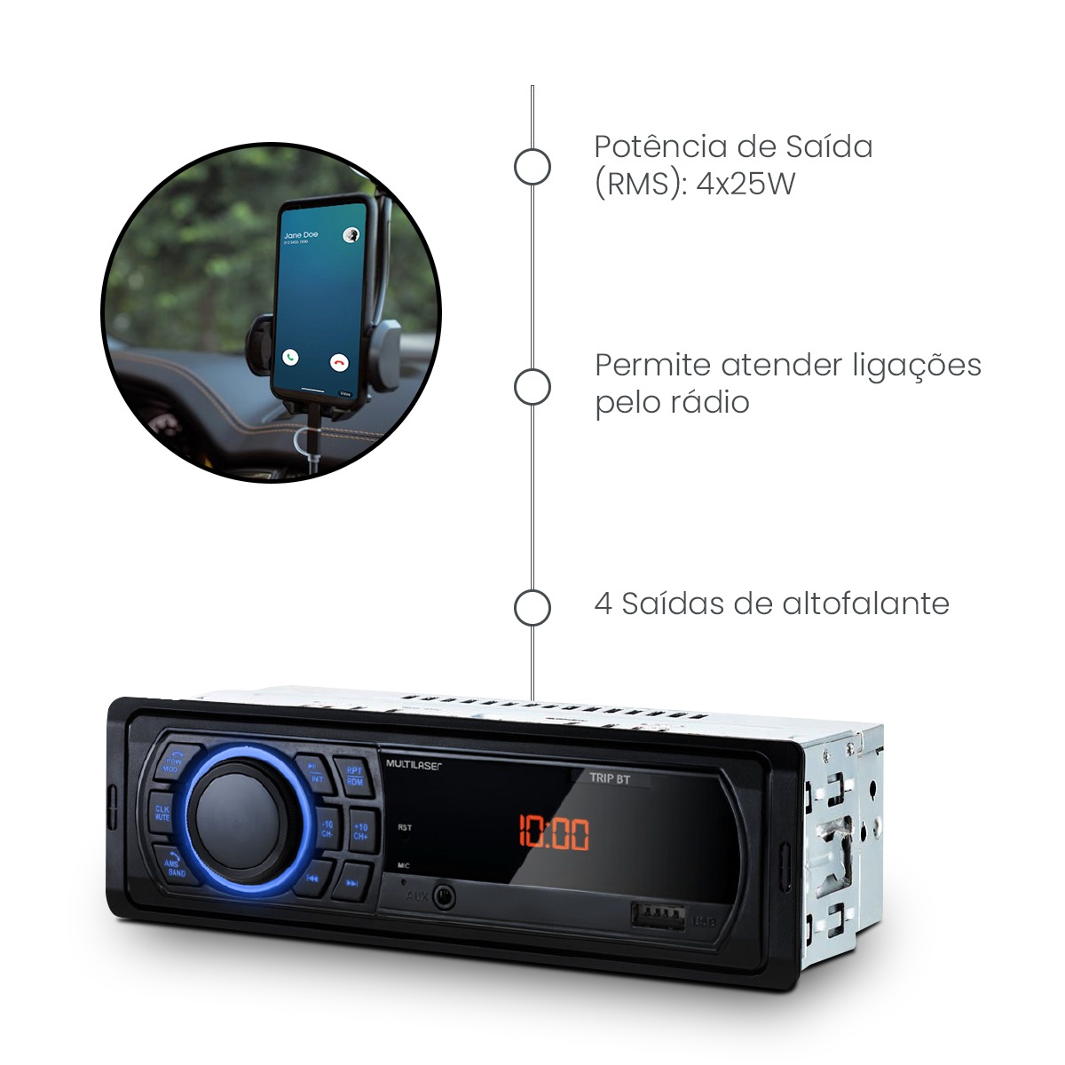A tela é tipo LED, impedância de 8 Ohms, e conta com relógio, modo mudo e reprodução aleatória (Random Play). Embora não possua TV, tem compatibilidade com Android e iOS.  Text link: P3344 – Autoradio Trip BT MP3 4X25WRMS FM/USB/AUX